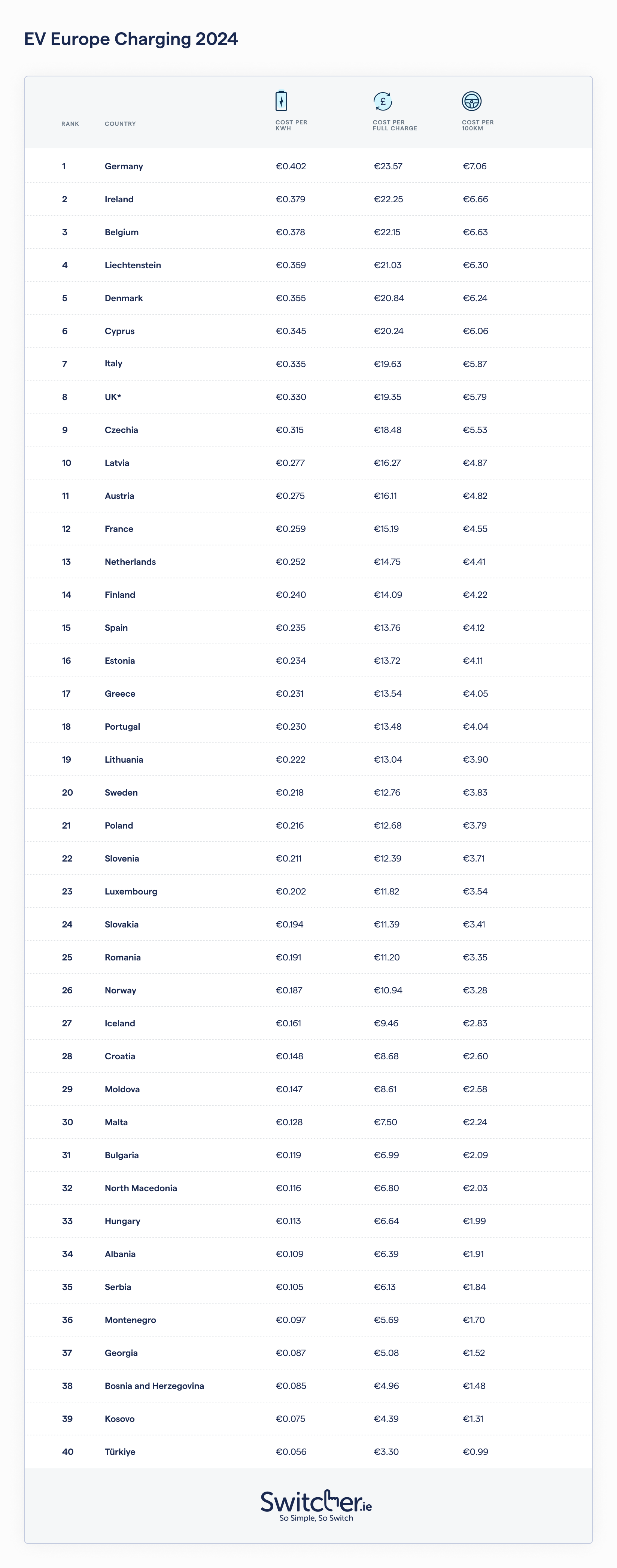 De acordo com uma investigação da Switcher Car Insurance, a Alemanha é o país mais caro para carregar carros elétricos em casa, custando 23,57 euros para um carregamento completo em casa. Por 7,06 euros conseguem obter a energia necessária para percorrer 100 km.